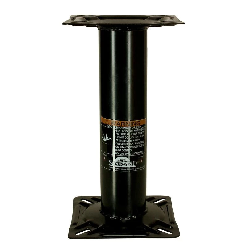 13″ fixed height economy pedestal with 7″ x 7″ square base and seat mount. Rugged, all steel construction. E-coat finish to resist corrosion and all weather conditions. For use with standard boat seats.