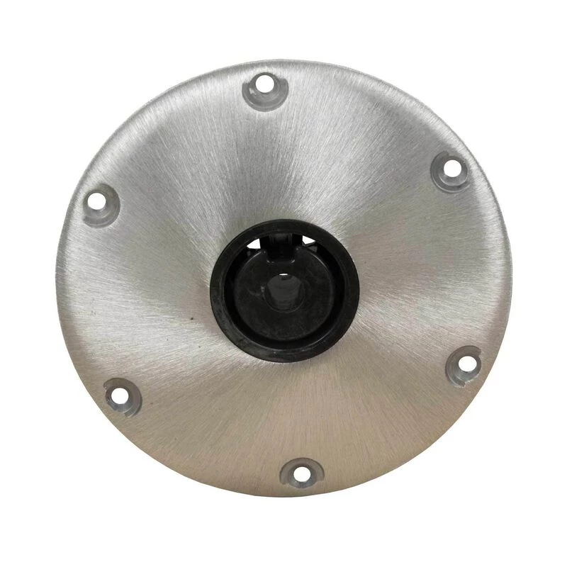 9″ round base with 8″ round hole pattern. satin finish, high-strength aluminum. Below the deck mount, requires 3-3/4″ hole in deck. Use with any 2-3/8″ plug-in post.