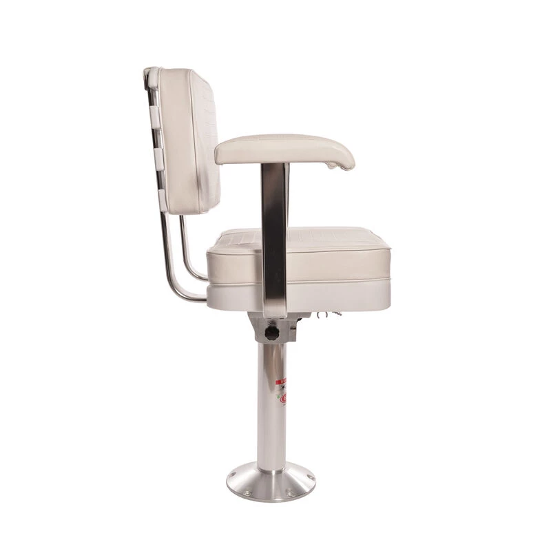 Classy and comfortable, the Gloucester Deluxe Ladder-Back Captain’s Chair is ideal for many center console or flybridge installations. Quality components include a high-density, rot-proof polyethylene base and a strong back comprised of anodized aluminum supports with “ladder-style”, UV-resistant polyethylene cross pieces. The seat and the back boast extra-thick, tufted, removable cushions, which like the armrests are covered with marine-grade vinyl. Package includes chair, removable marine-grade vinyl cushions and positive-locking swivel/slider mount that allows for 360° rotation and fore and aft adjustment. Pedestal is 15″ high with a 2 7/8″ diameter and has a 9″ diameter base.