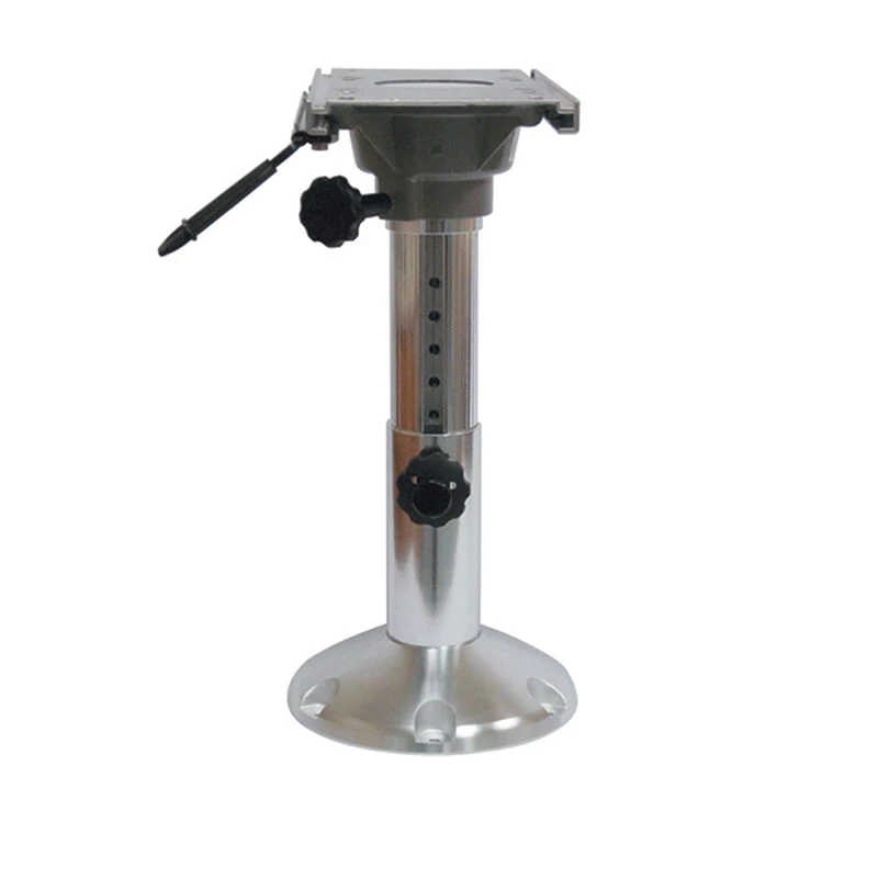 Wise 8WP21-374″ 13″ to 18″ Adjustable Height Pedestal with Slide features wide height adjustment and fore and aft travel. 2 7/8″ diameter thick wall post with 9″ diameter base plate with recessed mounting holes. Seat slide is extruded aluminum and allows 5″ of fore and aft travel. Constructed of extruded and cast polished aluminum. Cast aluminum seat mount locks and swivels 360 degrees with adjustment knob. Simply pull and turn the height adjustment knob to raise or lower your seat. BIA standard 4 bolt hole pattern fits virtually all seat brands.